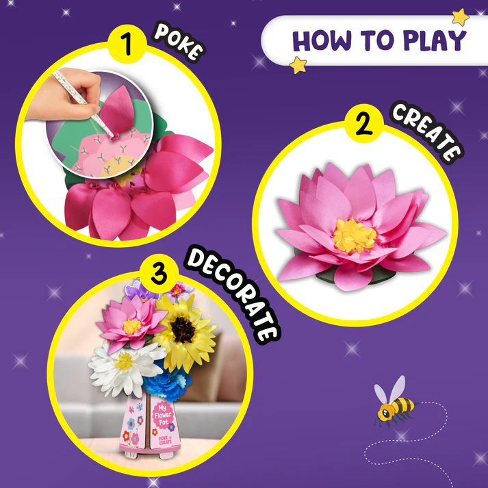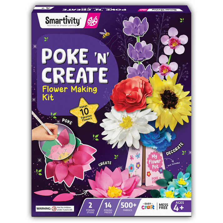 Welcome to the vibrant world of Poke ‘n’ Create! In this kit, your child will craft 10 beautiful flowers by joyfully poking bright fabric petals into their bases. They will also create and decorate an adorable flower pot with their handmade flowers. The kit includes tools like a poking pad, poking sticks, and step-by-step instructions for independent play. Let your child’s imagination soar while keeping their fingers happily busy!