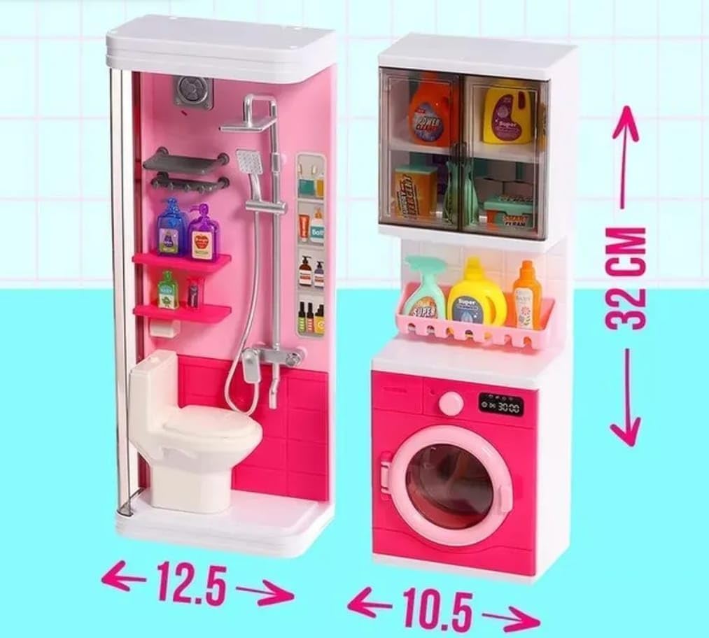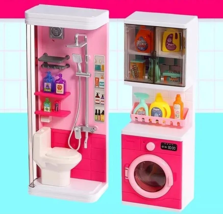 - Realistic Pretend Play Bathroom: Includes mini toilet, shower, sink, and washing machine for complete play fun.
