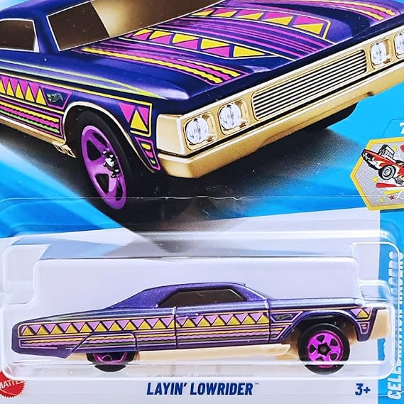 1:64 scale Hot Wheels Layin Lowrider from the Celebration Racers series. Features a cool Southern California style with fast wheels and red line tires. Great gift for birthdays, holidays, or school celebrations.
