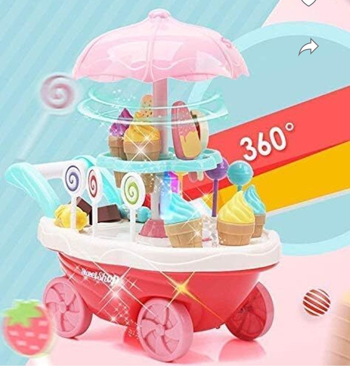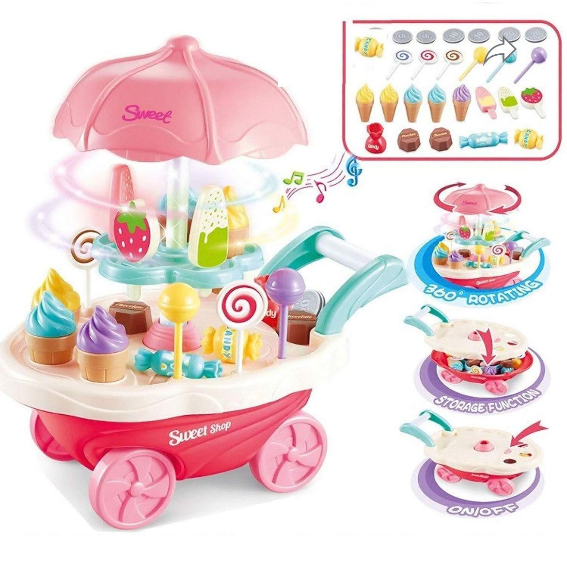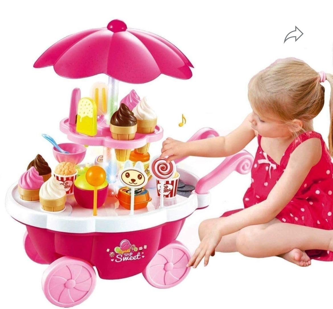 Musical Ice Cream Cart Toy Playset with vibrant lights and cheerful sounds, complete with a variety of ice creams, lollipops and tasty pretend treats for endless imaginative fun.