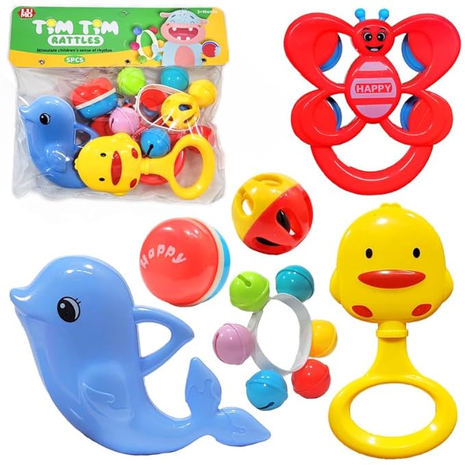 Keep your baby engaged with this fun and colourful 6-piece rattle toy set. Each rattle produces gentle sounds that help stimulate hearing and sensory development. Easy-to-hold shapes support grip strength and hand-eye coordination in early stages. Made from safe lightweight material, it is perfect for babies aged 3 months and above.