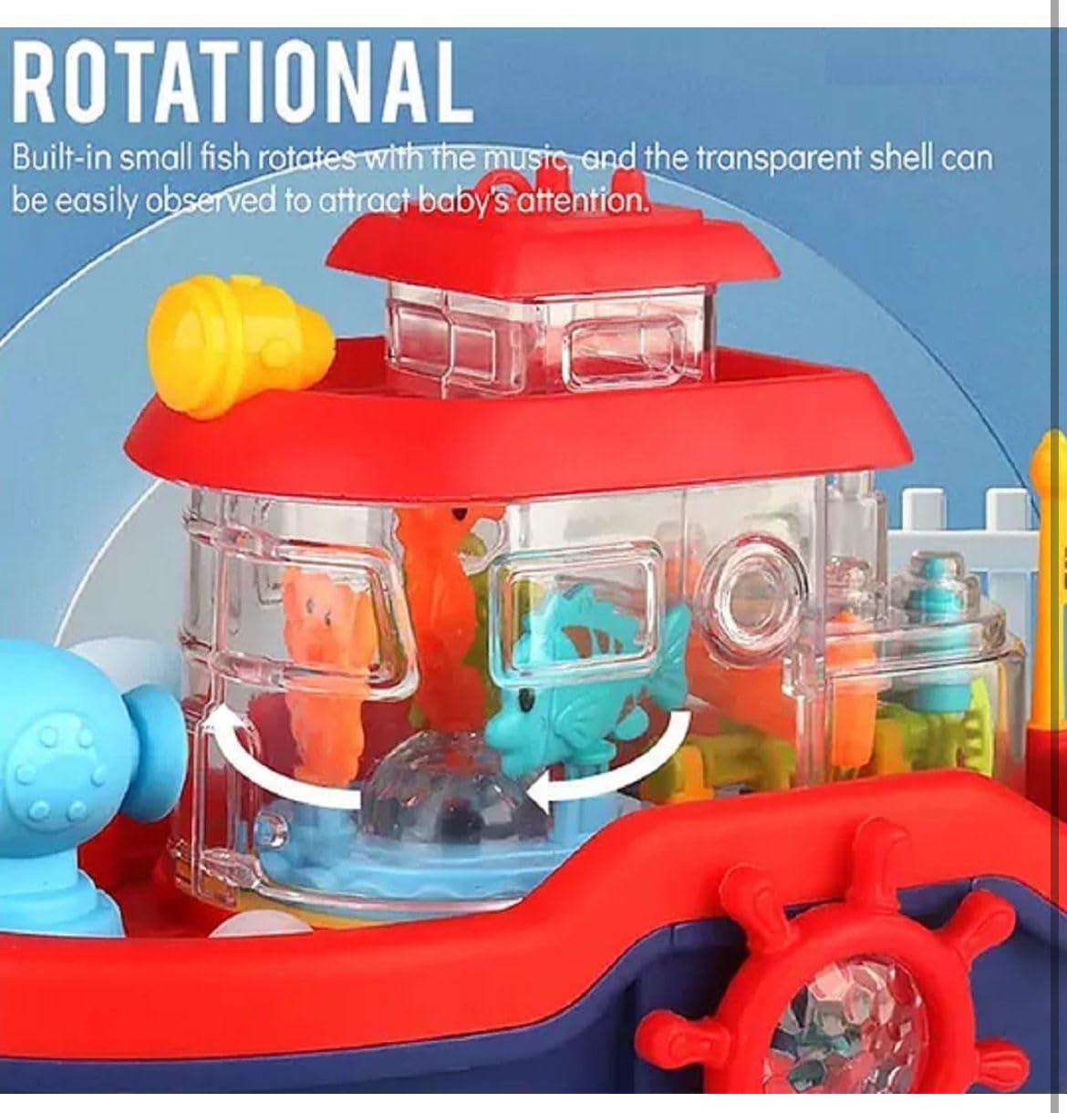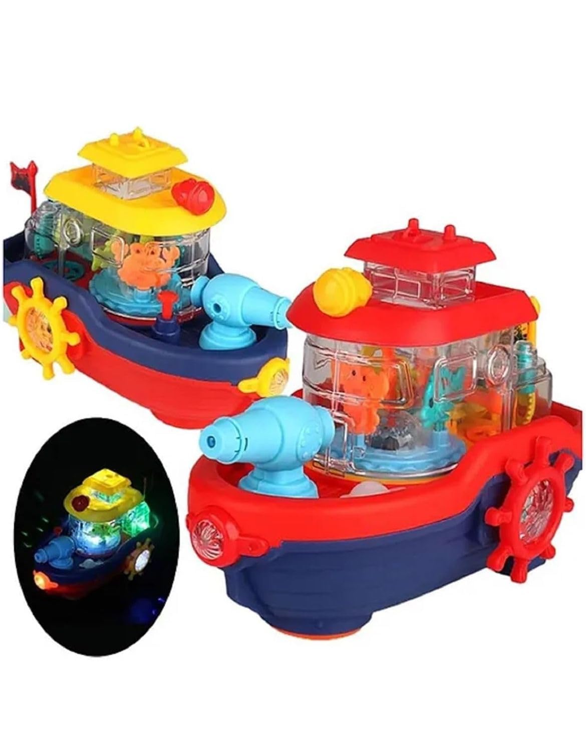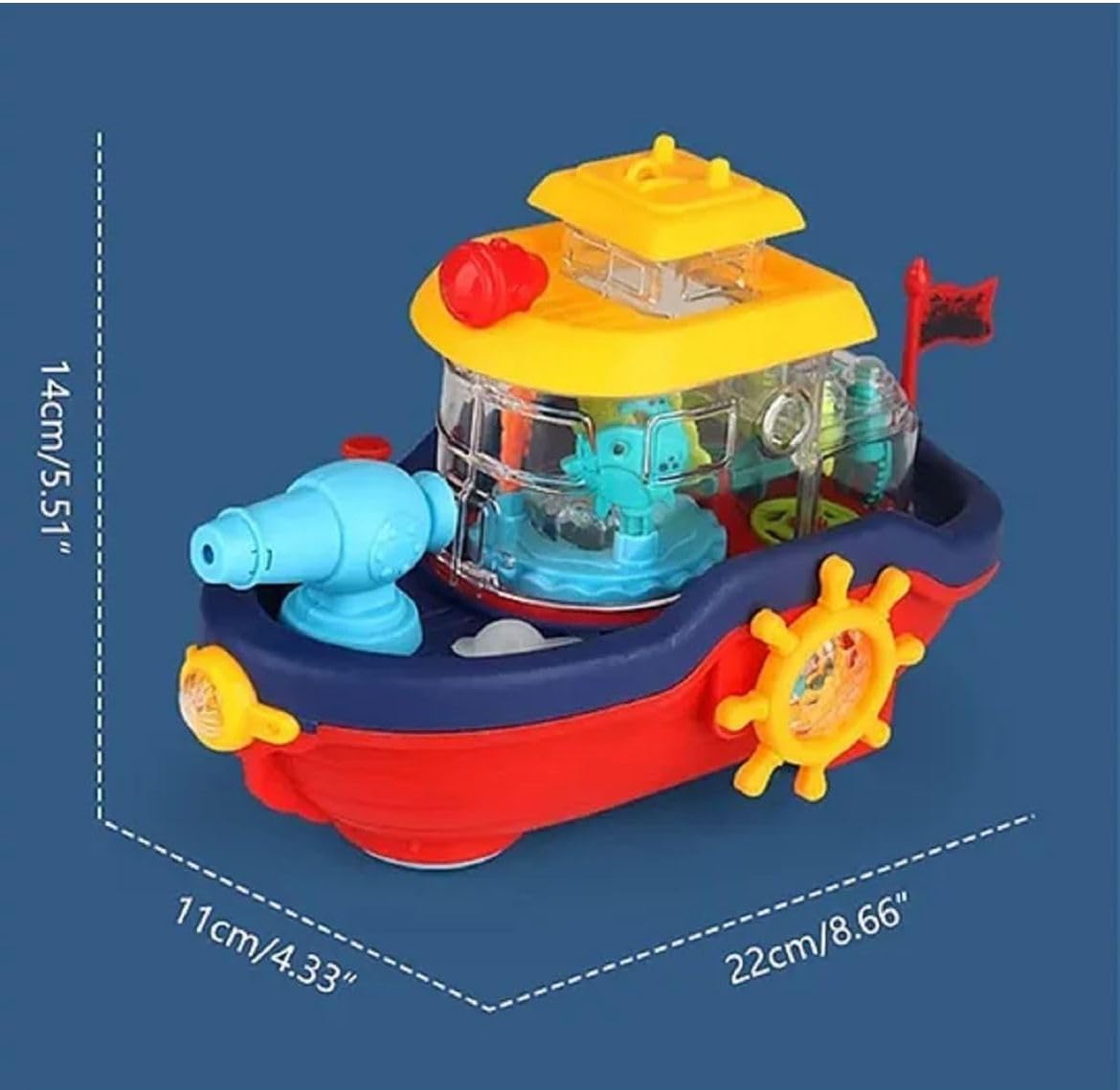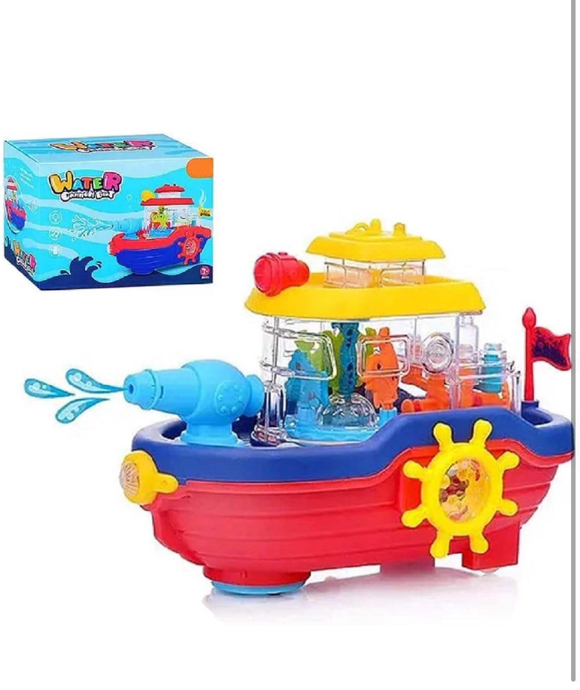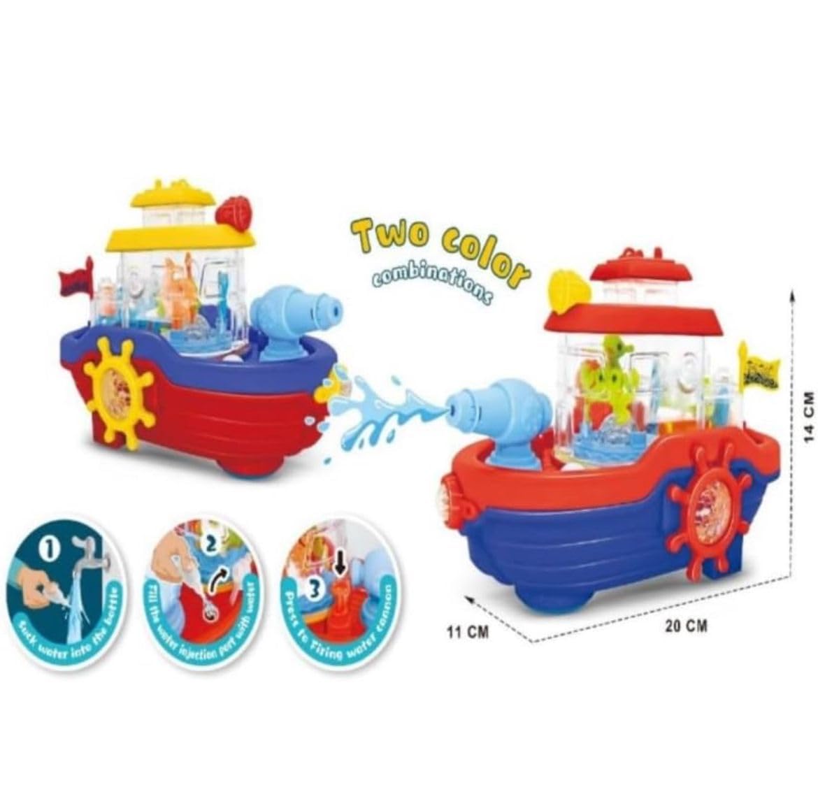 This vibrant toy boat features a water-spraying cannon, bump & go action, and lively music for an engaging play experience. Compact and easy to carry, it encourages imagination and motor skills, making it ideal for kids aged 3+.